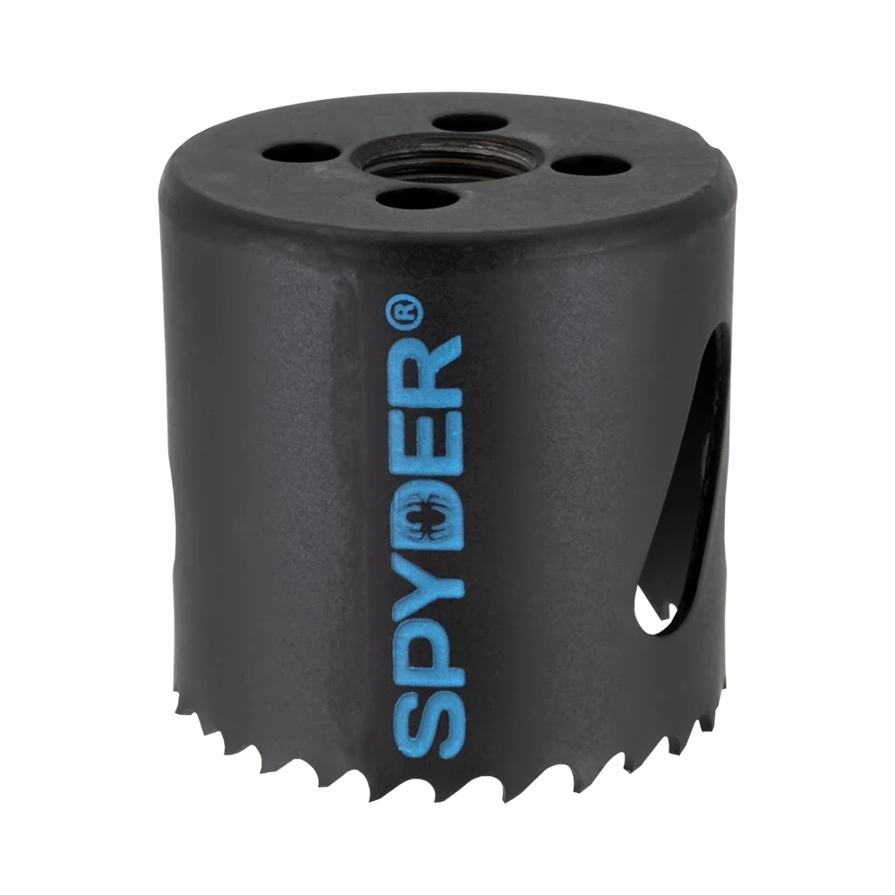 Spyder’s Bi-Metal hole saws feature variable tooth pitch geometry and bi-metal steel that make them the durable choice for making holes in wood with nails, metals and plastics. Use Spyder’s Rapid Core Eject™ arbor system to remove cores without prying — drill hole, press button, pull back the hole saw, and eject the core. Cut at an angle, and use two adapters (second adapter sold separately) on one pilot bit to enlarge existing holes. All Spyder hole saws fit on Spyder Rapid Core Eject™ arbor/pilot bits, and on universal hole saw arbors.